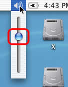 Macintosh上で設定されている音量を確認します。以下の手順で操作してください。なお、以下の画面はMac OS X 10.2.8 で動くパソコンの場合です。Mac OS X 10.2.8 でないパソコンや設定が異なっているパソコンでは、画面が異なることもありますので、あらかじめご了承ください。